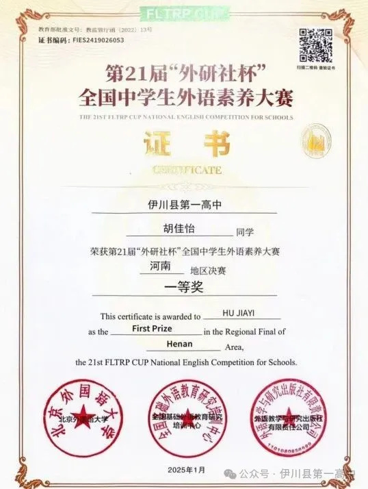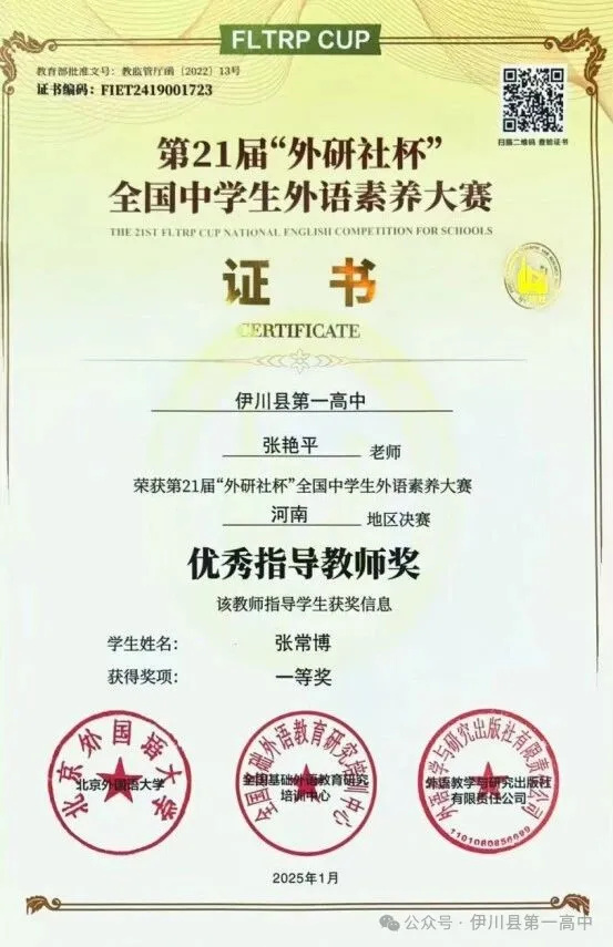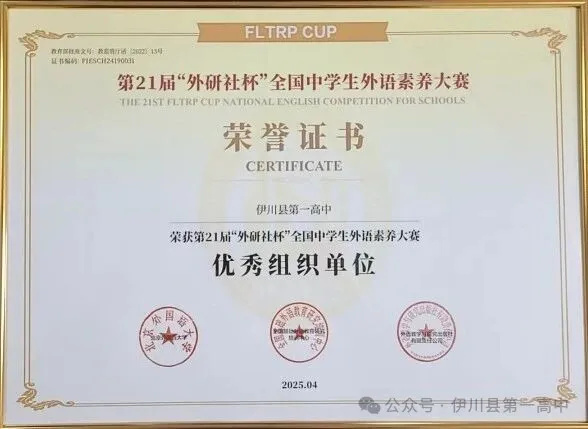 春风化雨育桃李,文以载道谱华章。在第21届“外研社杯”全国中学生外语素养大赛的荣誉殿堂里,伊川县第一高中凭借深耕英语教育的执着与担当,荣获“优秀组织单位”奖荣誉称号!